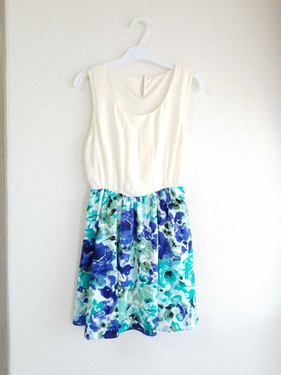 > ☆美品イングINGNIアイボリー×ブルー爽やかノースリーブワンピースM切り替えミニワンピ夏デート上品ひらひらスカート楽チンウエストゴム☆