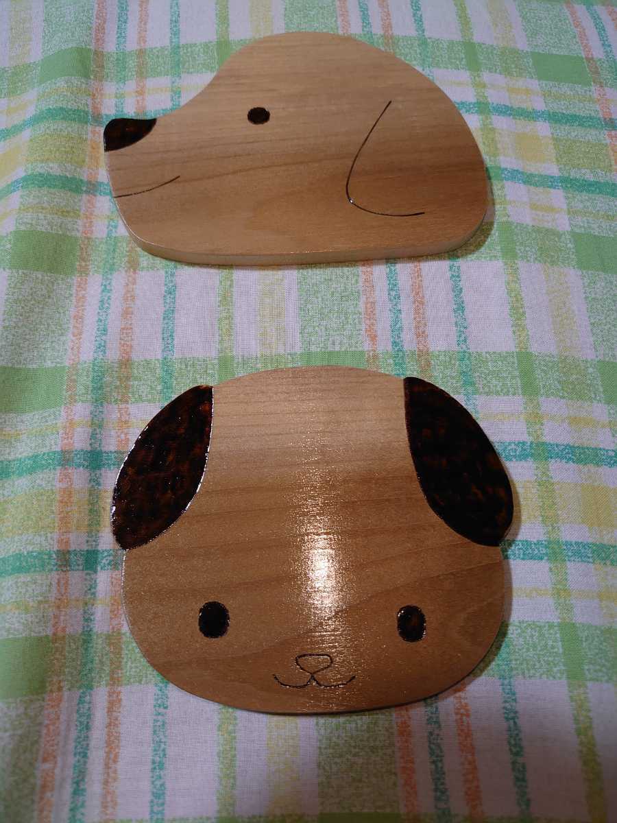 - 新品 手工芸品 わんこの顔 木のコースター2枚セット