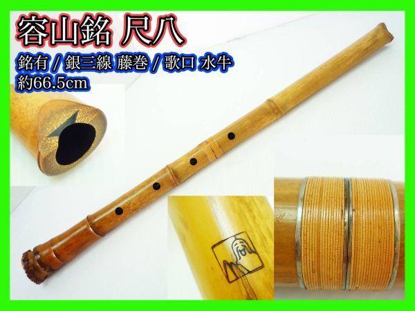 > 必見 容山 銘有 尺八 銀継 藤巻 銀三線巻 歌口水牛 刻印 在銘 約66.5cm 中継 竹製 内部漆 伝統 狂言 雅楽 能 和楽器 旧家蔵出 マニア_S3