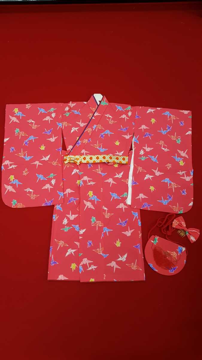 > 【加914】七五三 3歳用 二部式きもの ポーチ、リボンセット付き 三才 和装 子供着物 式典 記念 撮影 ピンク 折り鶴 210421