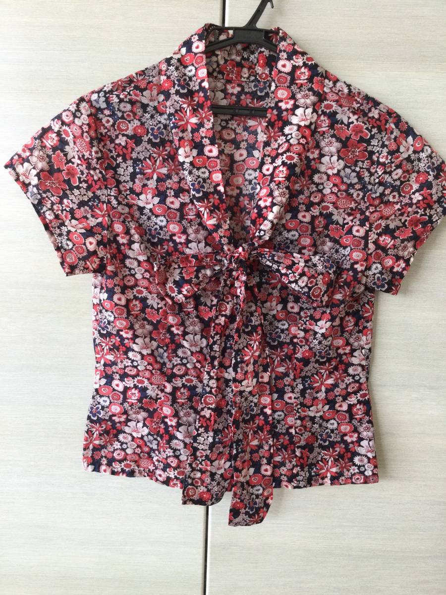 - リバティ プリント ハンドメイド 半袖 シャツ ブラウス ボータイ レディース S くるみボタン 中古品 ヴァルカナイズロンドン 送料込み