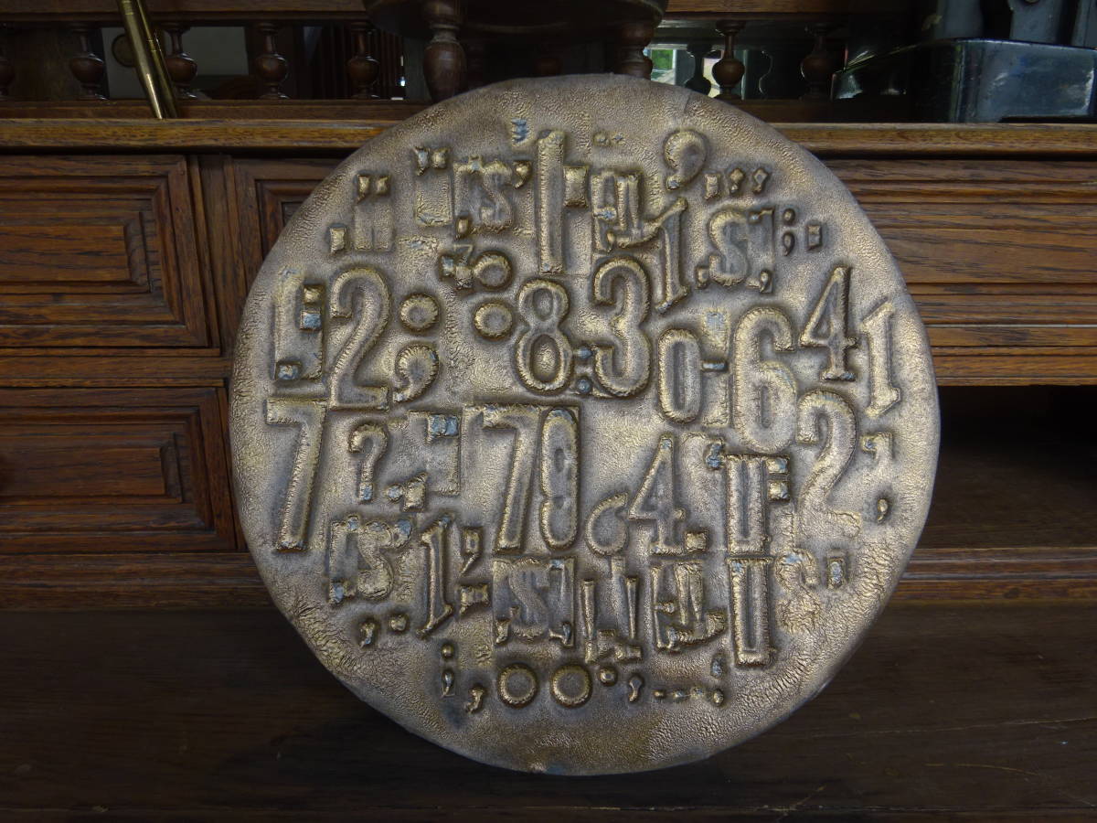 - 【陶板のナンバーレリーフ丸形】金彩プレートインテリア壁掛けオヴジェ皿アンティーク調陶器数字記号スタンプ判子活版印刷置物