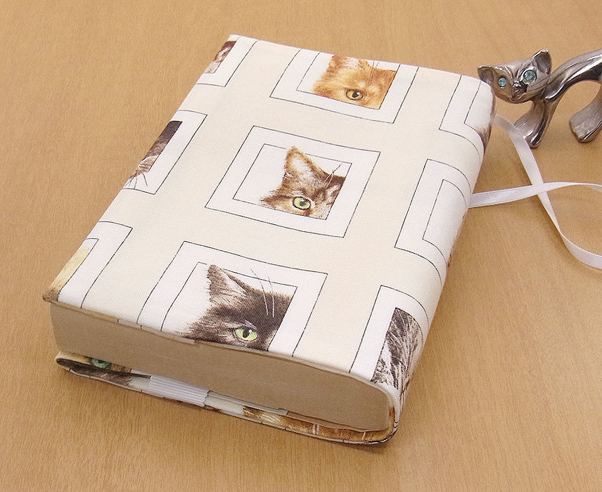 - 71 B ハンドメイド 文庫本② ブックカバー のぞく猫たち 薄ベージュ 四角 猫 ねこ キャット cat プレゼント 贈り物 飾り物は含まない