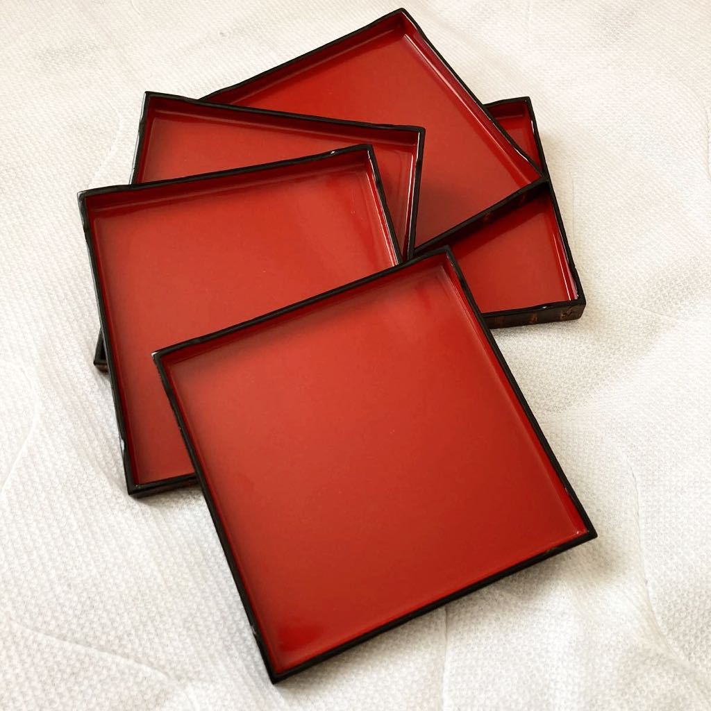 > a81)桜 樺細工 角皿 5客組 菓子皿 漆器 角館 秋田 工芸品 正方形 皿 器 ウレタン塗装 漆 和食器