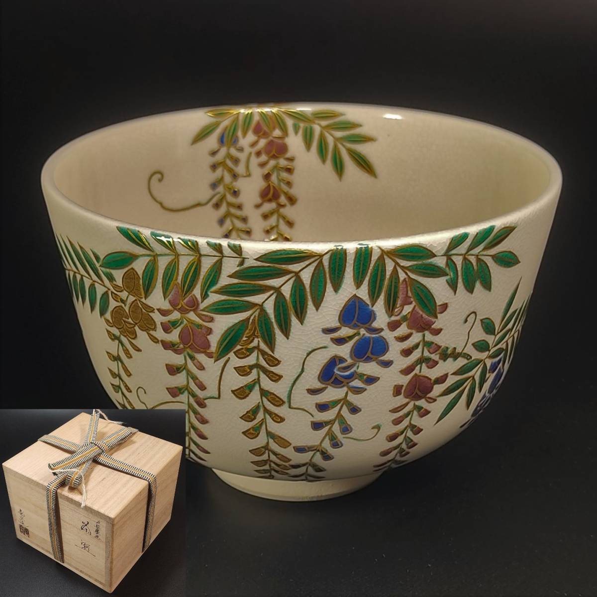 - 茶道具 茶碗 相模竜宝 竜宝造 色絵藤画 木箱付き / 茶碗の重量約223g 茶碗の最大幅約123mm