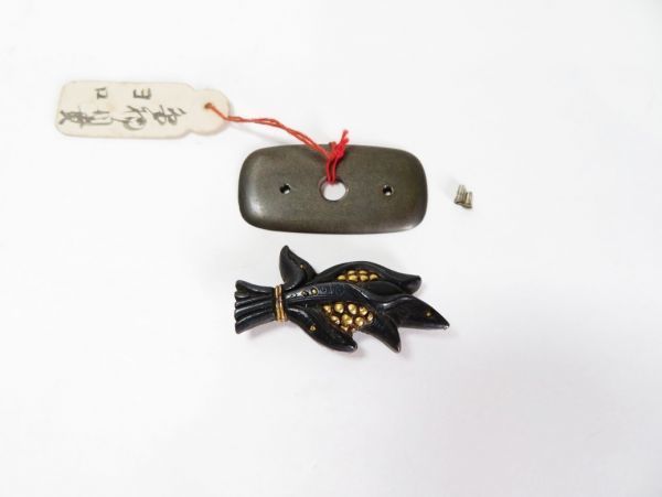 > 【1719】明治時代 煙草入れの前金具 赤銅地 南天象嵌 ネジ付(煙草入金具・腰堤・コレクター一括買取品)