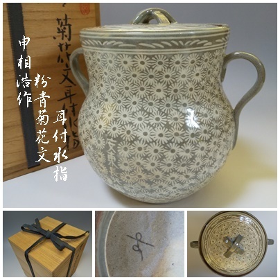 - 【T-20】申相浩 粉青菊花文耳付 水指 共箱付 茶道具