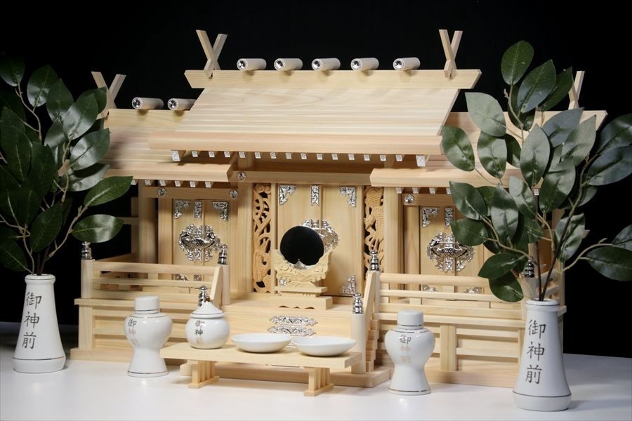 - 鳳凰三社シルバー金具・大 ■ 屋根違い ■ 銀風三社 鳳凰の彫刻 特大型 ■ 金文字神具 神棚セット