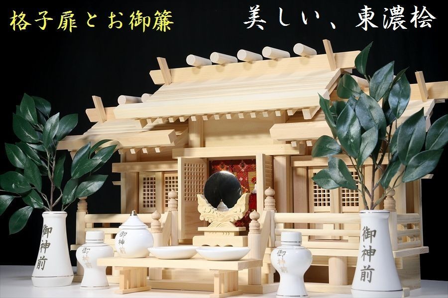 - 新寸高床格子付三社 大 ■ 美しい、東濃桧 ■ 高床造り 屋根違い 大型 ■ 御簾と格子扉 低床屋根 神棚セット
