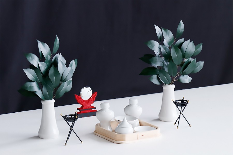 - 稲荷専用 神具セット 13品目 ■ 稲荷紋入り 高杯仕様 ■ ひのき 折敷付 ■ 小・中型 神棚 に最適 土器セット ■ 真鍮製 金属本鏡