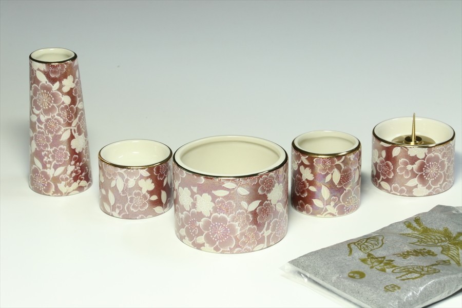 - 仏具■花柄 5点セット ミニ ワイン■モダン 家具調 仏壇 お供え■香炉灰付