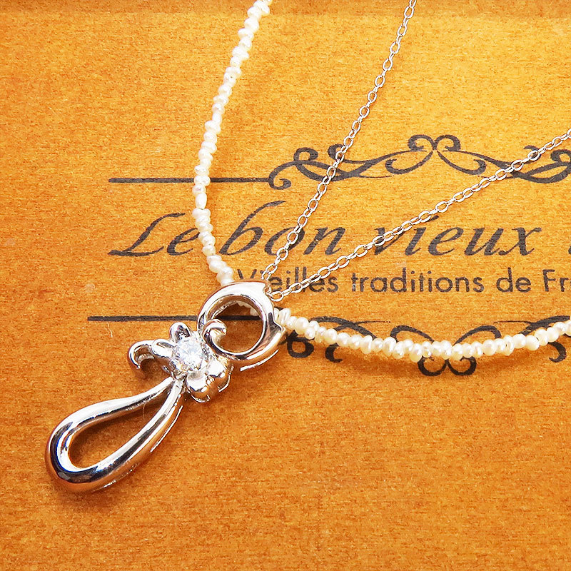 - シルバー925の猫シルエットモチーフと小粒の淡水パールをつなぎ合わせたパールネックレス ジルコン