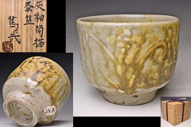 > 濱田篤哉 ★ 灰釉 筒描 茶碗 ★ 共箱 ★ イッチン描きに灰釉が良い景色の逸品 ★ 父:人間国宝 浜田庄司 ★ 益子焼 ★ 検 浜田晋作