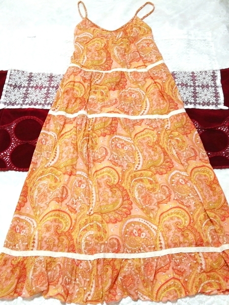 > 橙オレンジエスニック柄綿ネグリジェキャミソールスカートマキシワンピース Orange ethnic pattern cotton negligee camisole maxi dress