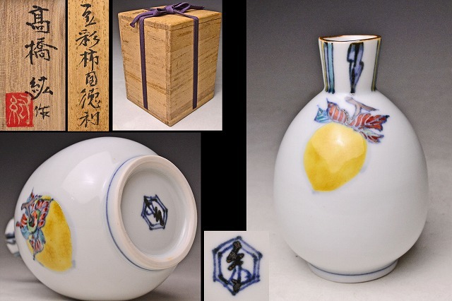 > 高橋絋 ★ 豆彩 柿図 徳利 ★ 共箱 ★薫陶:人間国宝 藤本能道 / 加藤土師萌 ★ 色合いが美しい逸品 ★ 酒器 ★ 京焼