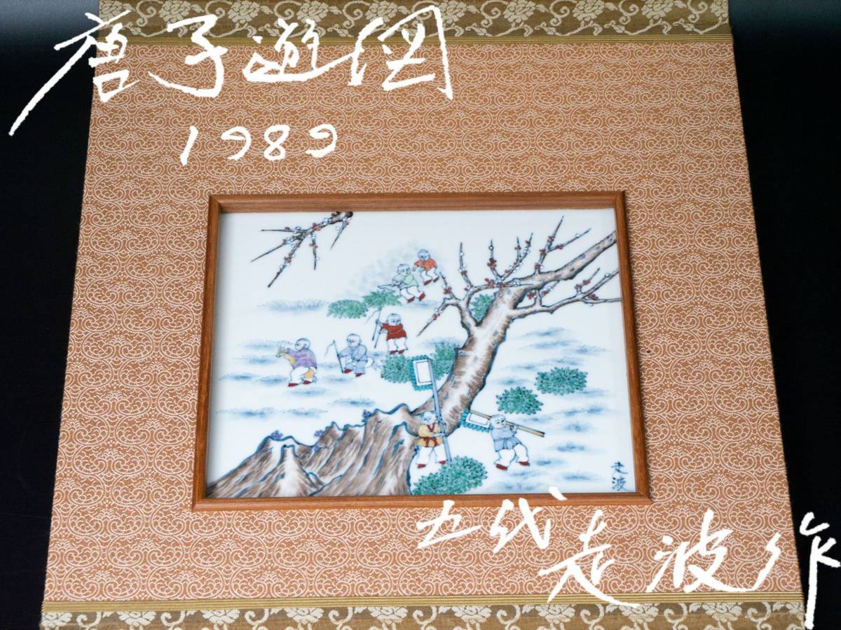 - 【値下げ交渉有り】 名工 人気作家 五代 佐藤走波 造 染錦 唐子遊図 陶板 風鎮 掛軸型額装付