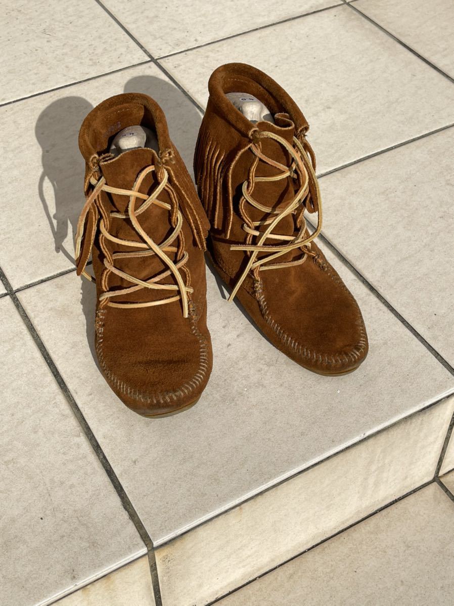 - ☆ミネトンカ☆サイズ6☆22.5~23㎝☆ハーフブーツ ショートブーツにフリンジがとっても可愛いミネトンカ