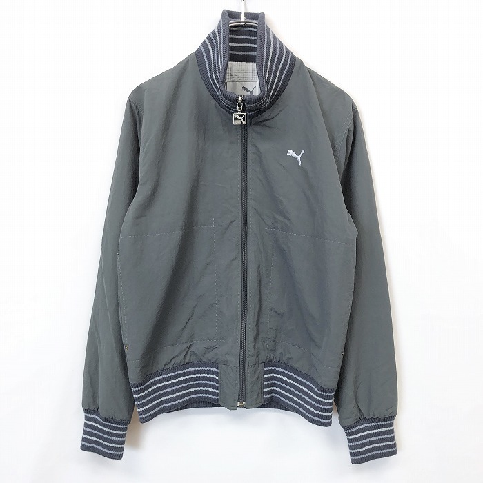 - PUMA プーマ M レディース 薄手 ジップアップ ブルゾン ジャケット 裏地付き ハイネック ボーダー柄のリブ生地 長袖 ナイロン100% グレー系