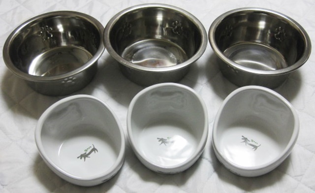 - ペット用 犬用 陶製食器3個 ステンレスボウル3個 皿 うつわ 白 犬柄