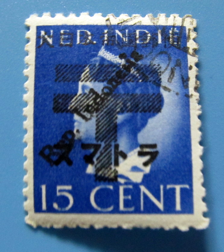 - 南方占領地 切手★インドネシア独立 加刷 15c スマトラ 大日本帝国郵便 加刷 裏のり 丸まり 使用済み