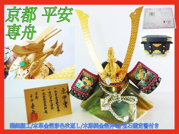 > 京甲冑 京都平安専舟 五月人形 宝石鑑定書 本革金箔彩色吹返し 螺鈿獅子 18号 兜 木彫純金箔押竜 メノウ瑪瑙 豪華絢爛伝統工芸 参考16万_①