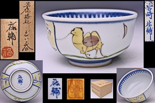> 宮崎祐輔★ 染錦 駱駝 ぐい呑 ★ 共箱 共布 栞 ★ のんびりとした景色が癒される逸品 ★ シルクロード ★ 佐賀県 酒器 ★