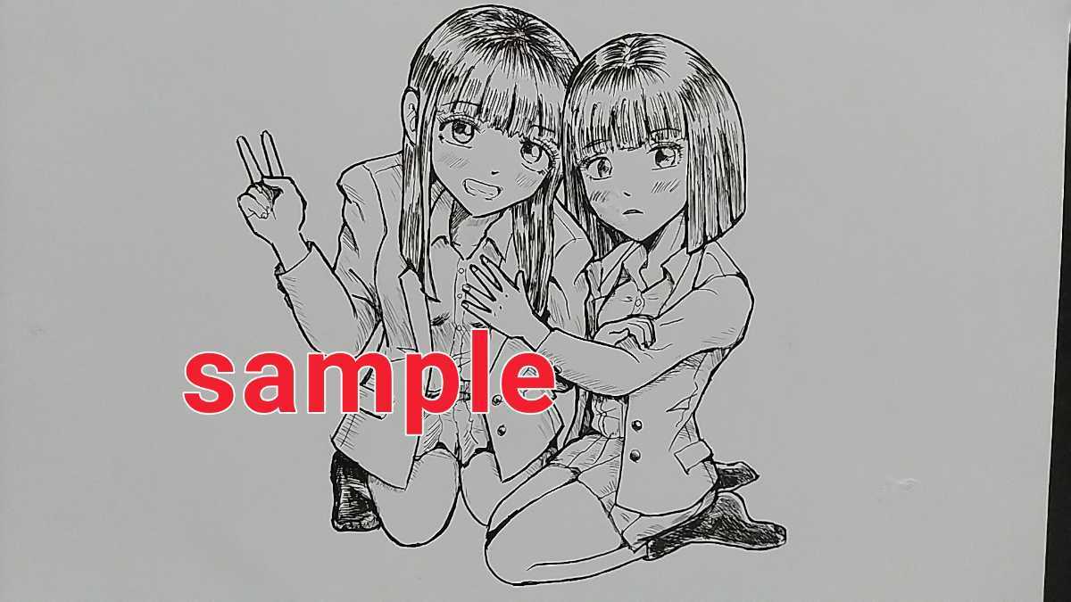 - 手描きイラスト 寄り添う女の子 モノクロ