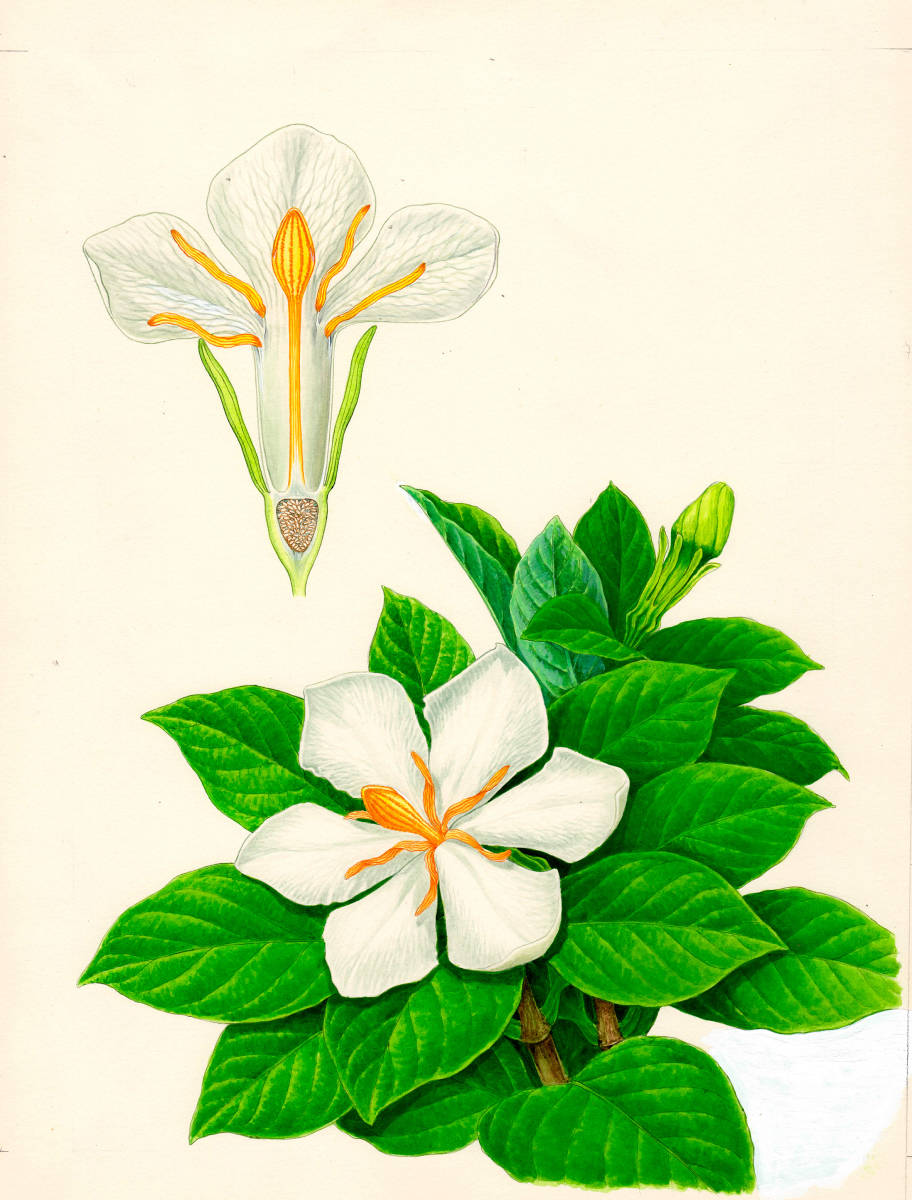 - 水彩画 植物細密画「くちなし」 真作