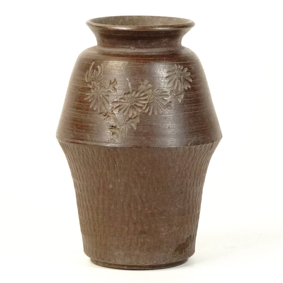 - 細密彫刻が目を引く逸品!昭和ビンテージ 萬古焼 花紋・飛び鉋 朱泥花器 直径10㎝高さ15.5㎝ 経年の味わい職人の細密彫刻が素晴らしい!TKM