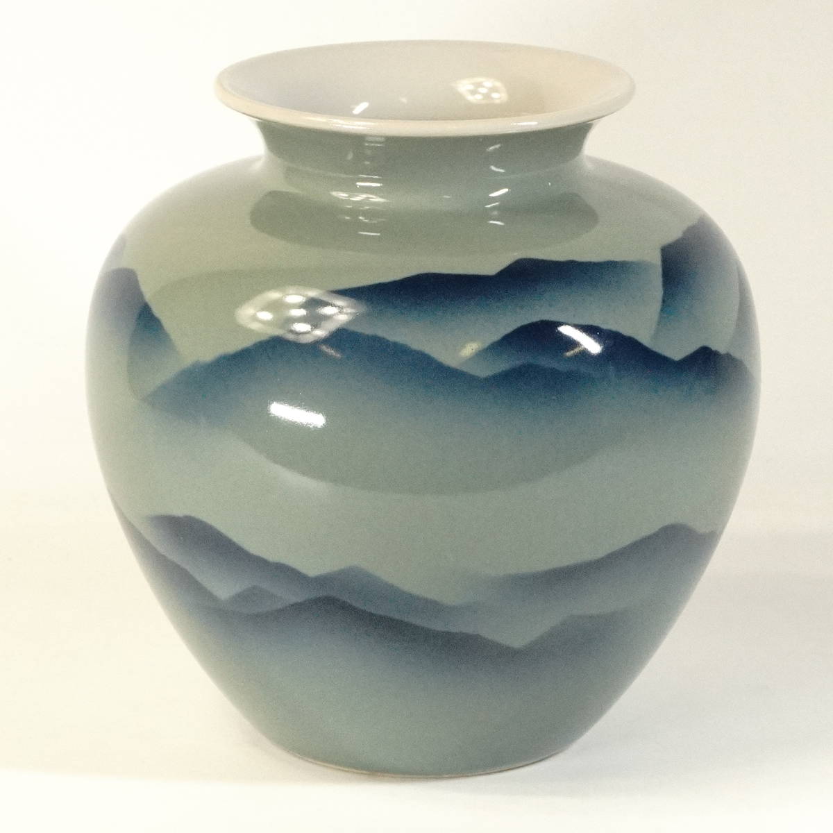 - 青磁と青い連山の調和がとても美しい逸品です!昭和ビンテージ 九谷焼 長山造 連山紋青磁花瓶 花器 壺 直径19㎝ 高さ19.5㎝ TKM