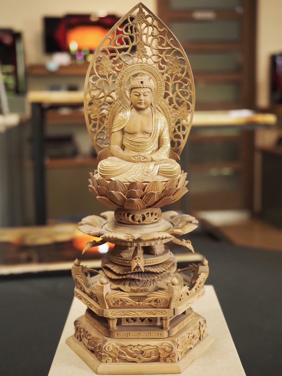 - 新品未使用 総印度白檀 座弥陀 2.5号 金泥書 六角ケマン付き台座 木彫 仏像