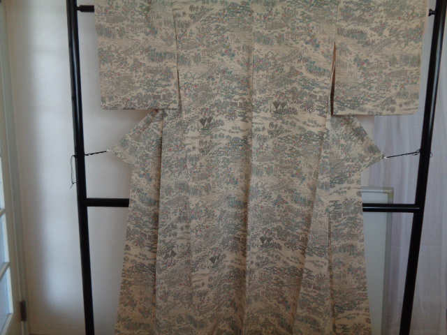 > D120-80 正絹 小紋 縮緬 広襟 総柄 手染め 流水花草風景文 昭和レトロ 着物 アンティーク