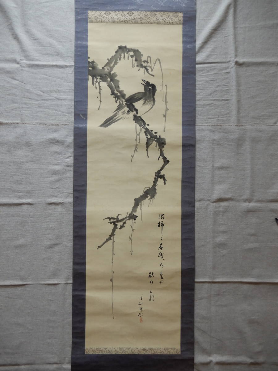 - 軸装紙本俳画「枝の鳥/渋柿・名残・秋の暮」銘・落款あり 軸48㎝程