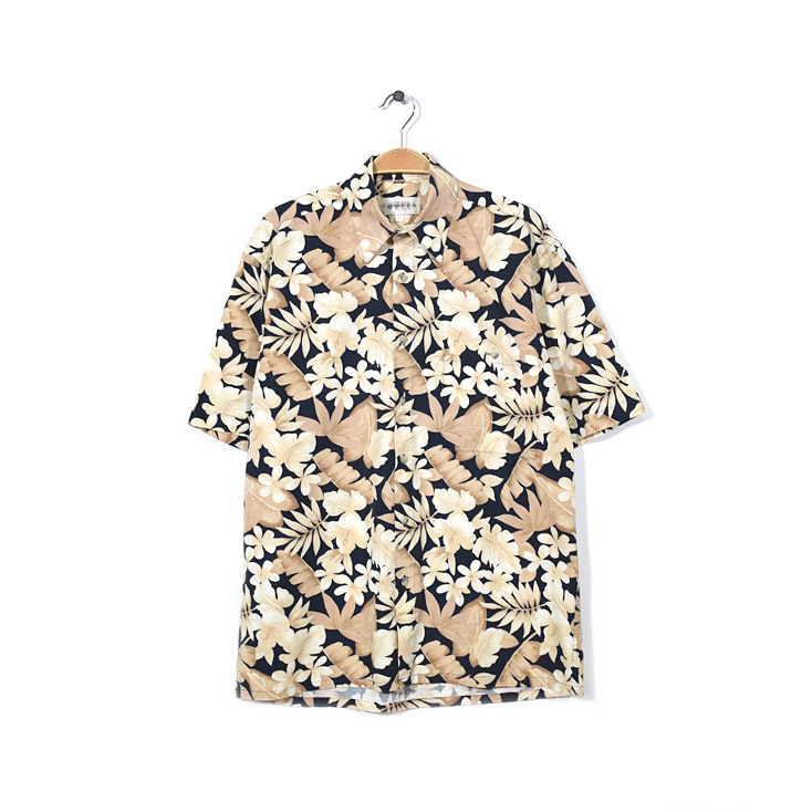 - 【送料無料】 CAMPIA MODA コットン 総柄 アロハシャツ ハワイアンシャツ メンズS 黒アロハ ブラック ヴィンテージ アメカジ 古着 CB1083