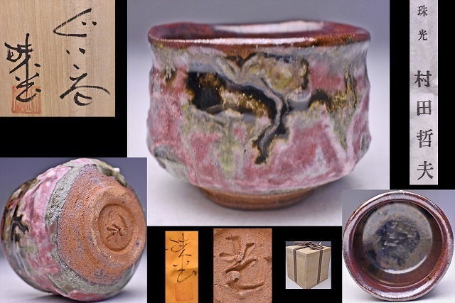 > 村田珠光 ( 村田哲夫 )★ ぐい呑 ★ 共箱共布栞 ★ 上作 ★ 窯変鼠志野 ★ 様々な釉薬等の混ざりあい ★ 景色最高!★