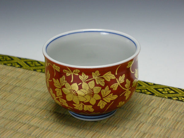 - 九谷焼 人間国宝 吉田美統 金襴手花唐草文ぐい呑(赤)