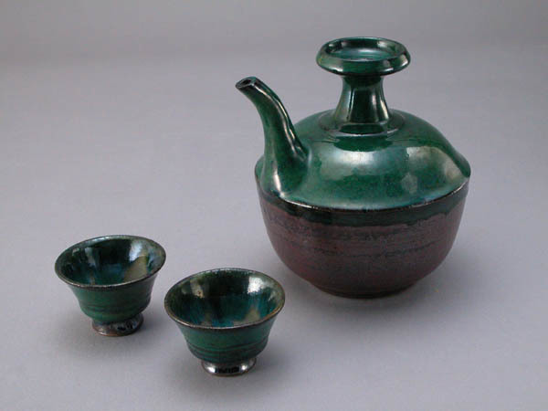 - 壺屋焼 小橋川清次 作 緑釉半酒器(カラカラセット)共箱付