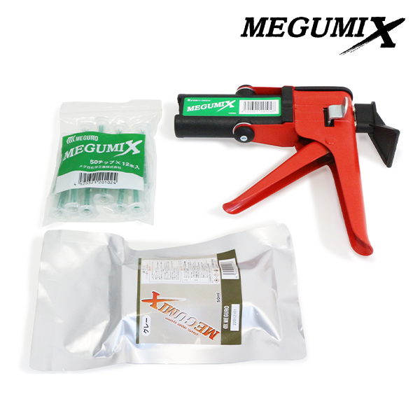 - 3点セット メグミックス メグロ化学工業 グレー 遅乾タイプ 50ml 充填用ガン 50チップ 1袋 (12本入り) 120286 120283 120280 MEGUMIX