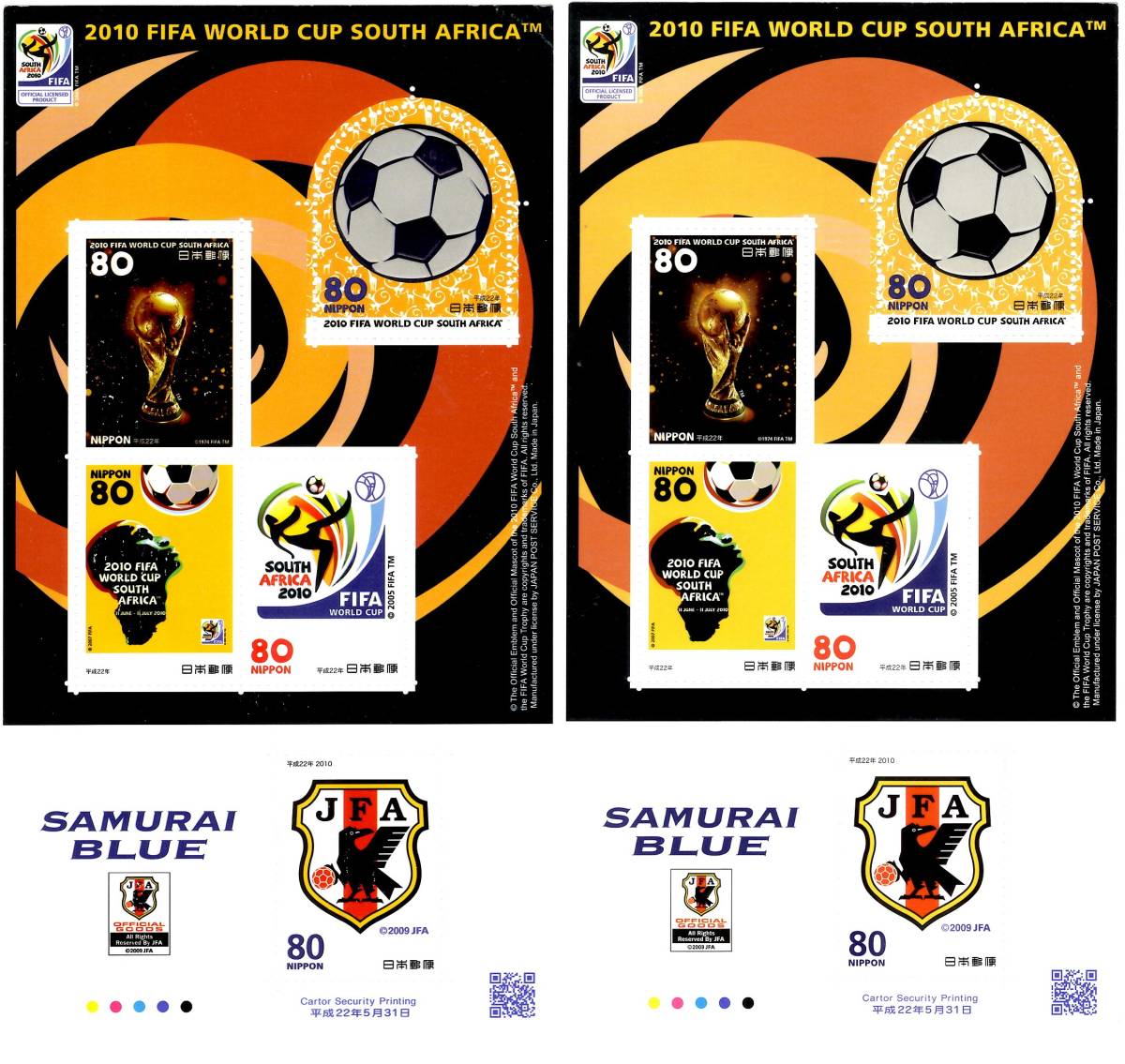 - 【刷色バラエティー】 FIFA ワールドカップ2010 小型シート2枚 製造面 サッカー 日本 記念 未使用