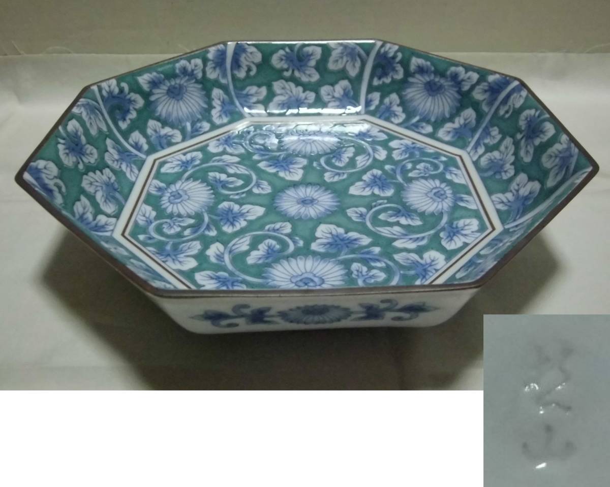 - 大皿 八角 窯印有り 染付 唐草 24.3㎝ 盛皿 プレート 陶器 工芸品 食器 レトロ