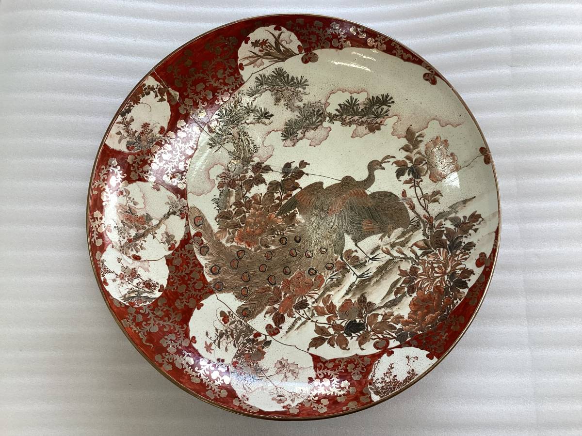- 九谷焼 明治九谷? 大皿 明治時代 孔雀 飾皿 額皿 尺皿 K146