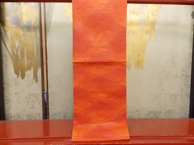 > きもの今昔4389 名古屋帯(京袋) 正絹引き箔 臙脂赤地に引き箔の濃淡 エジプト壁画文様