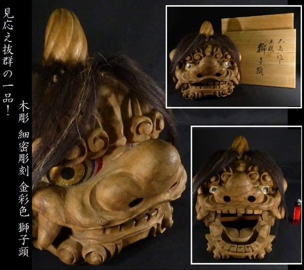 【 恵 #0123 】 見応え抜群の一品! 木彫 細密彫刻 金彩色 獅子頭 検:縁起物/置物/獅子/古玩拍卖
