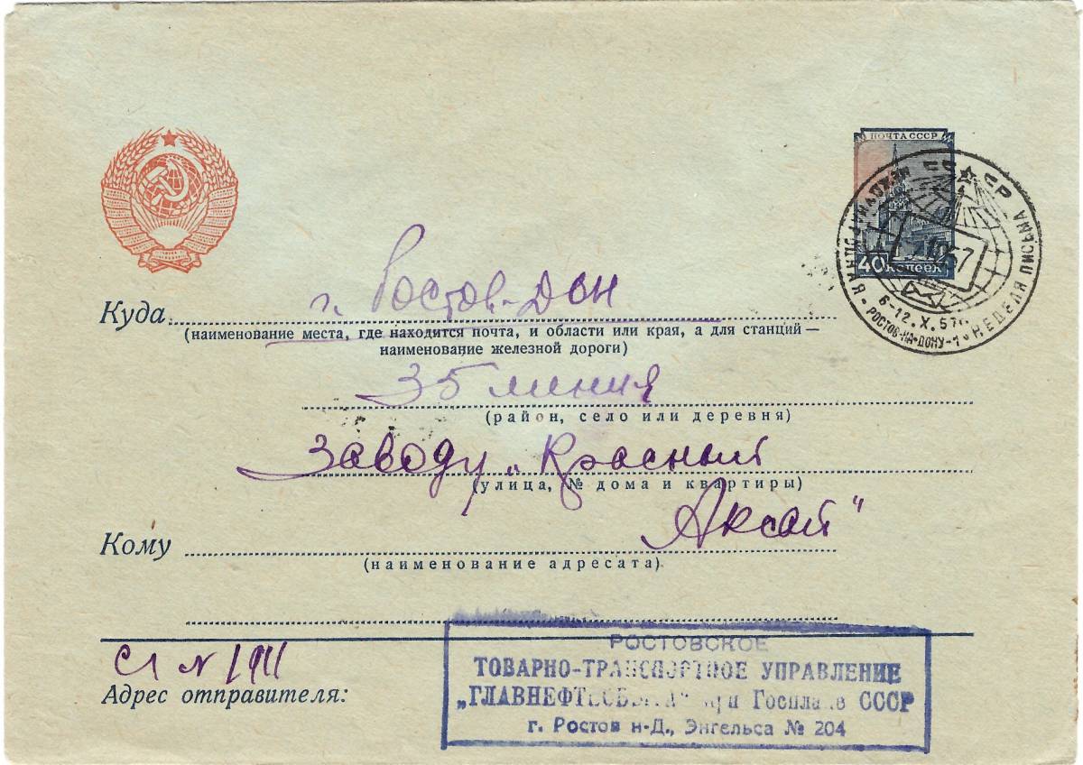 - 1957 ソ連 ロストフ・ナ・ドヌー 国際文通週間 カバー 官製封筒
