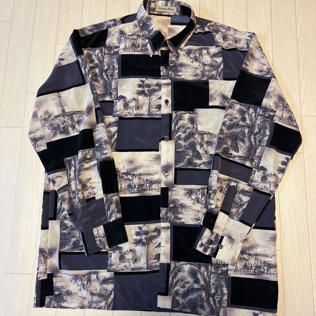 - Country Wood 総柄 柄シャツ 風景 レトロ アート ビンテージ 長袖シャツ ポリエステル
