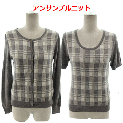 > クリアインプレッション CLEAR IMPRESSION アンサンブルニット カーディガン 丸首 長袖 ニット 半袖 チェック グレー 白 ゴールド 2