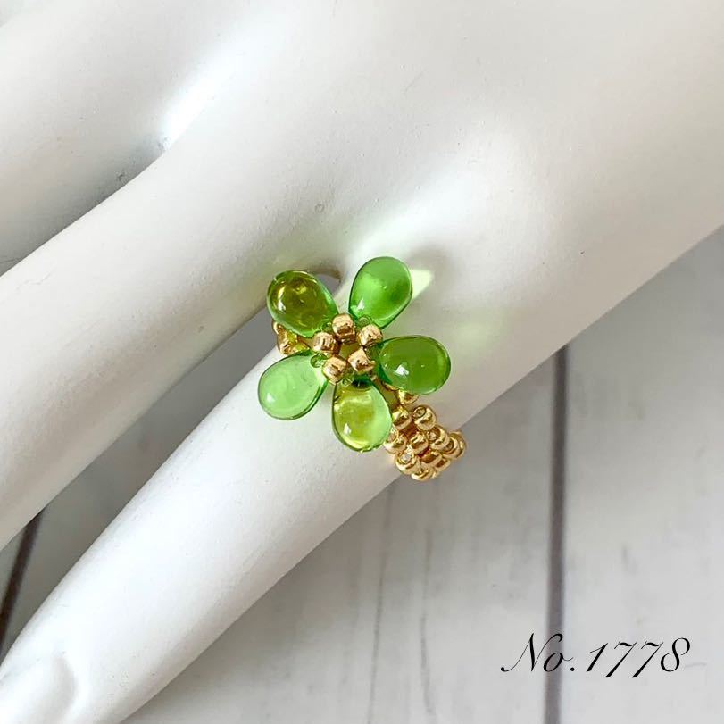 - ハンドメイド*チェコドロップビーズ フラワーモチーフ リング 指輪 ライトグリーン 10号 ビーズアクセサリー No.1778