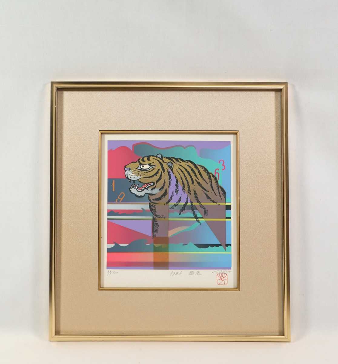 - 真作 河野芳夫 シルクスクリーン「猛虎」画 21.5×22cm 大阪市出身 前衛集団”極”を結成 現実に密着した新しい美の創造 勇ましい勇姿 6926