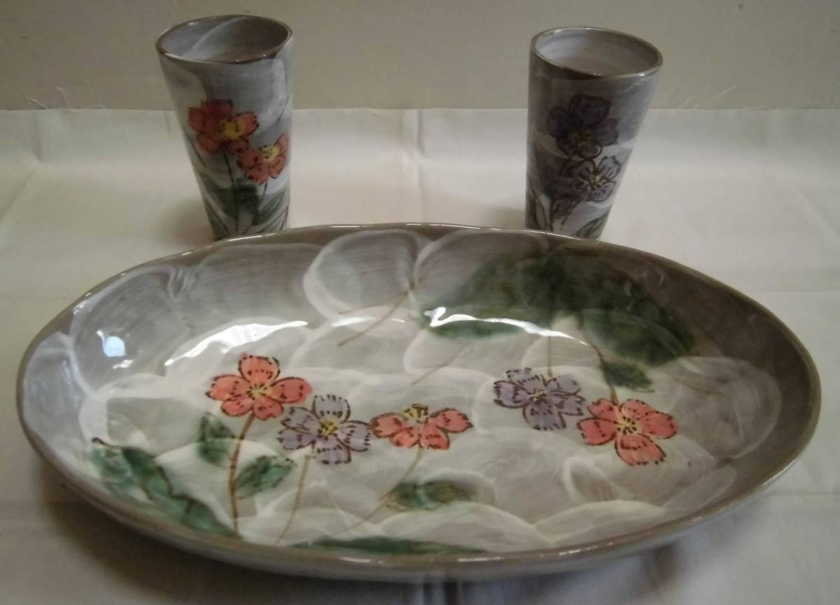 > フリーカップ 2客 色違い 中鉢 楕円 小判形 花柄 色絵 ビール ビア お茶 湯呑み茶器 コップ タンブラー 食器 陶器 工芸品 レトロ
