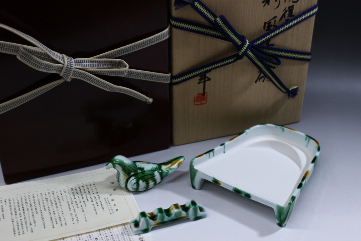 - d735 技工名品 人間国宝 加藤卓男 正倉院復元 三彩風字陶硯 二重箱 共箱 栞付 硯 水滴 筆置 書道具 煎茶道具 本物保証◆検)加藤幸兵衛